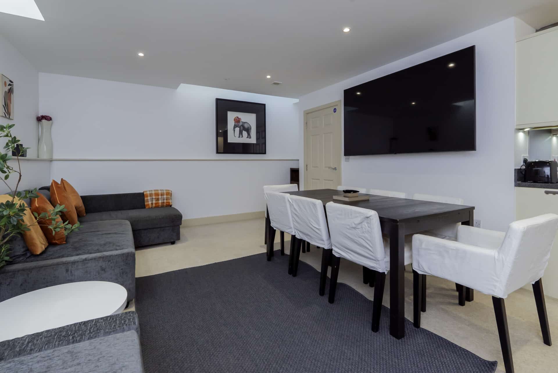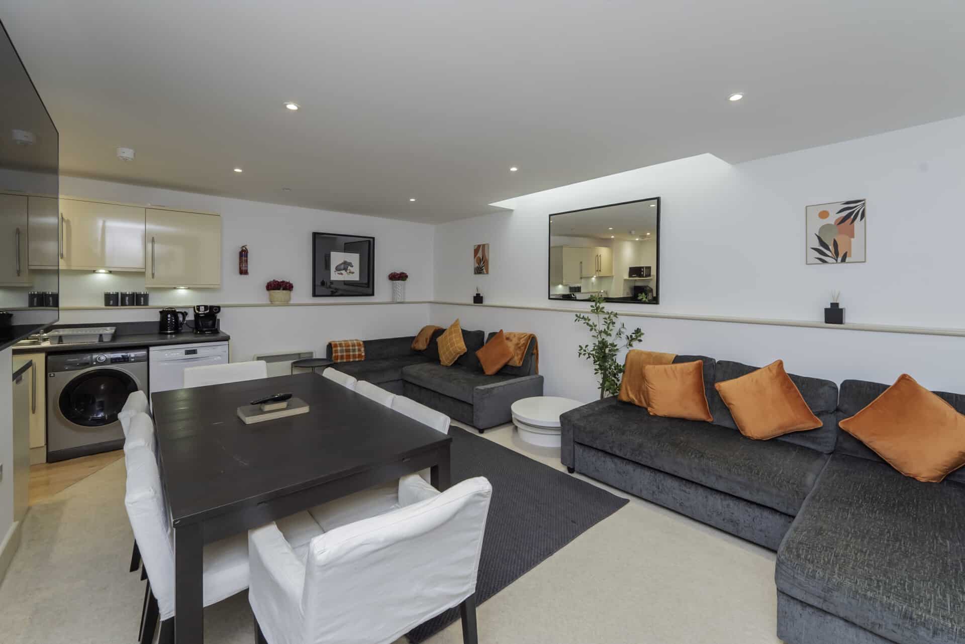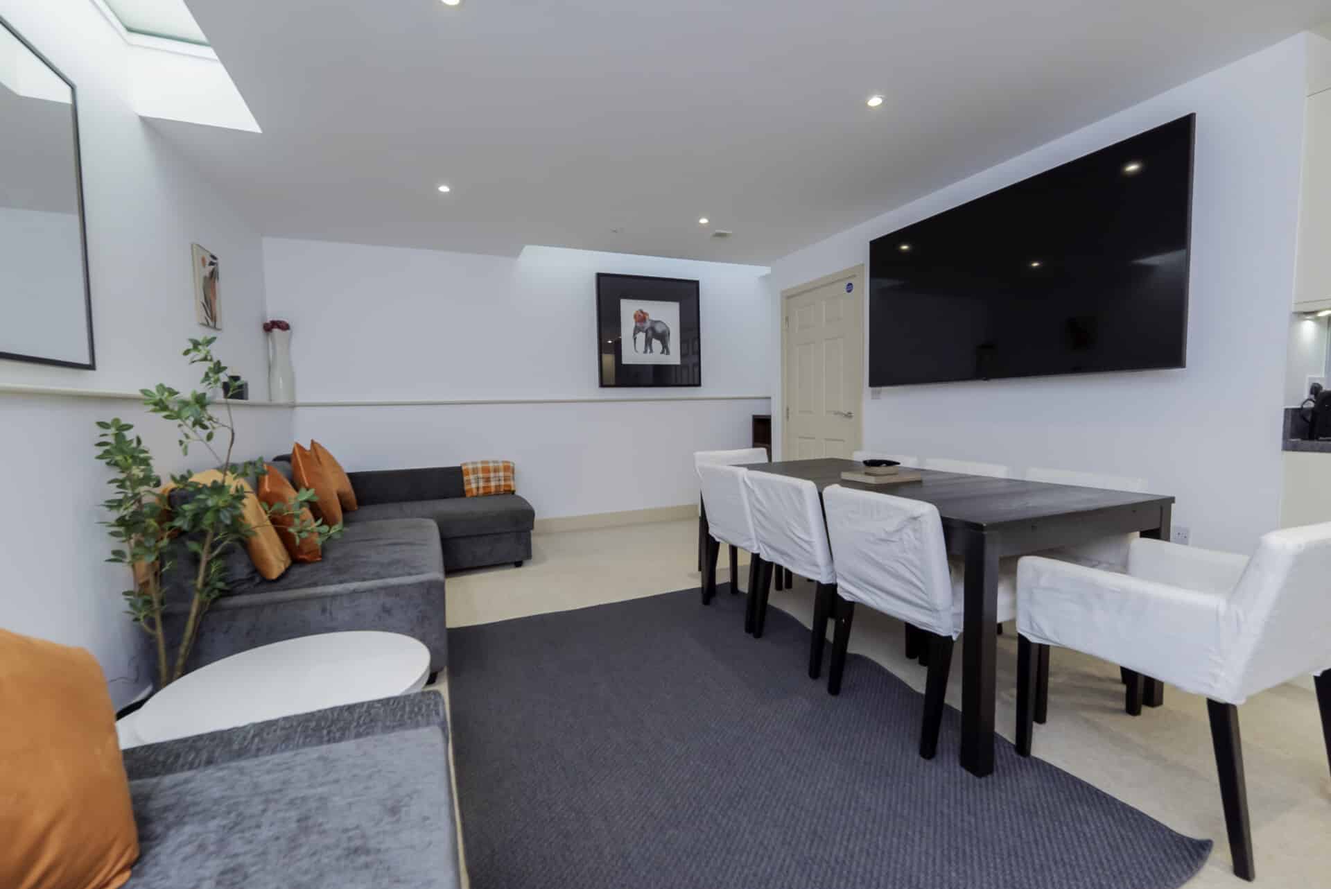 The property is arranged over three floors and features a bright open-plan kitchen, dining, and living area complete with a large TV and sofa beds, creating a relaxed and sociable space. There are four well-sized bedrooms with flexible sleeping arrangements, including zip-and-link beds, plus a dedicated office space on the ground floor for remote work. Guests also benefit from two bathrooms, making it suitable for larger groups.