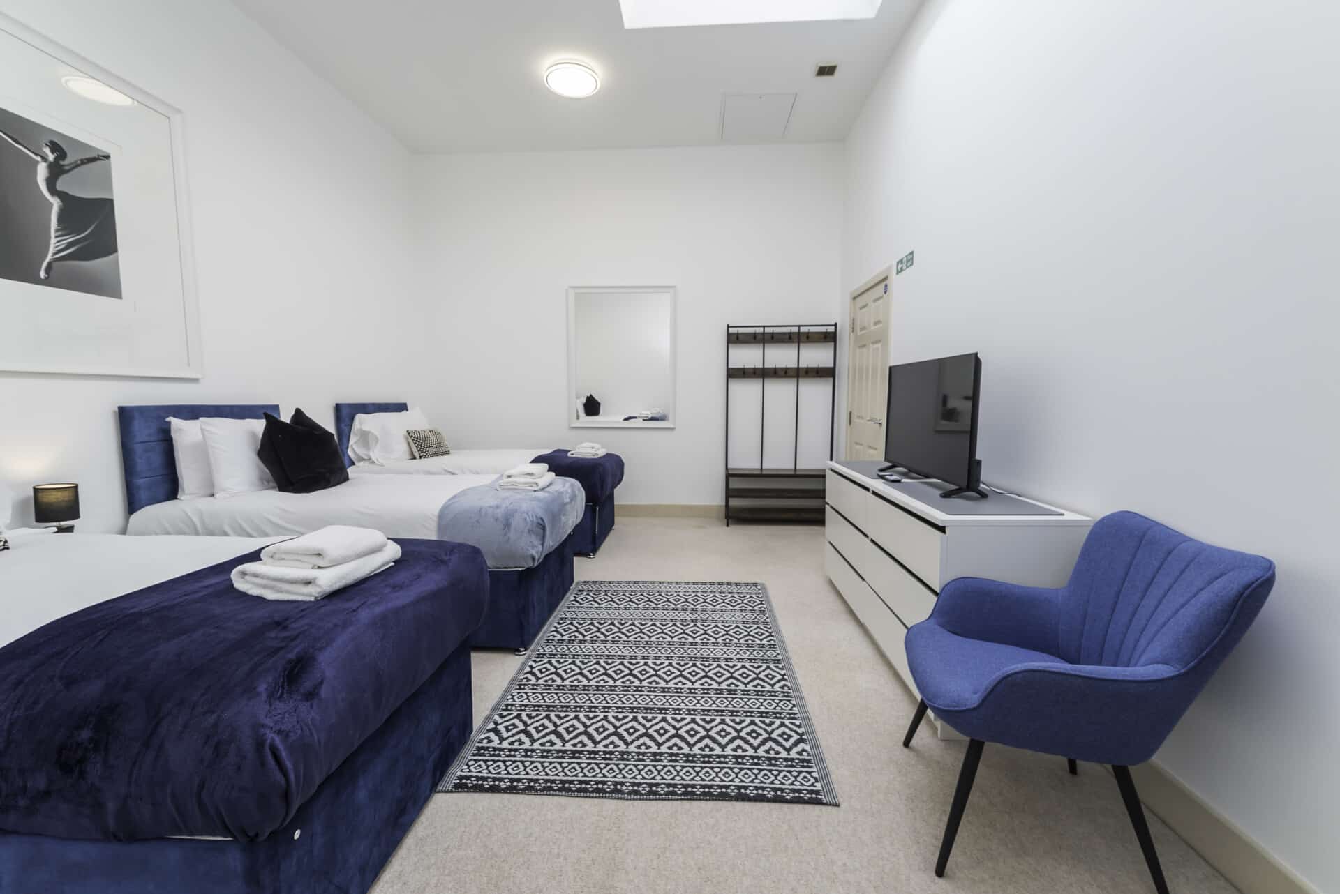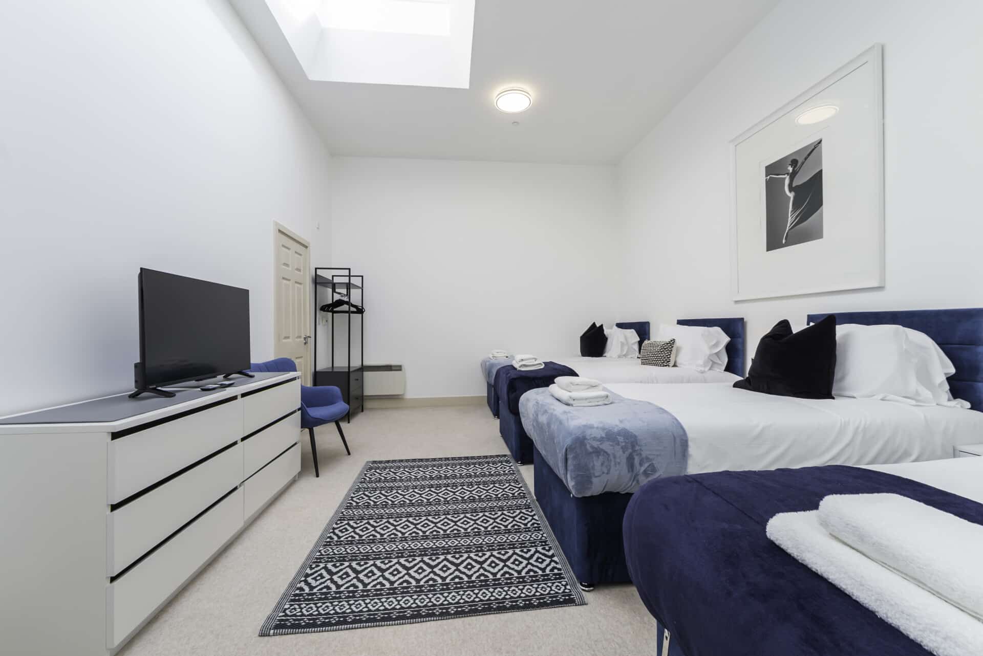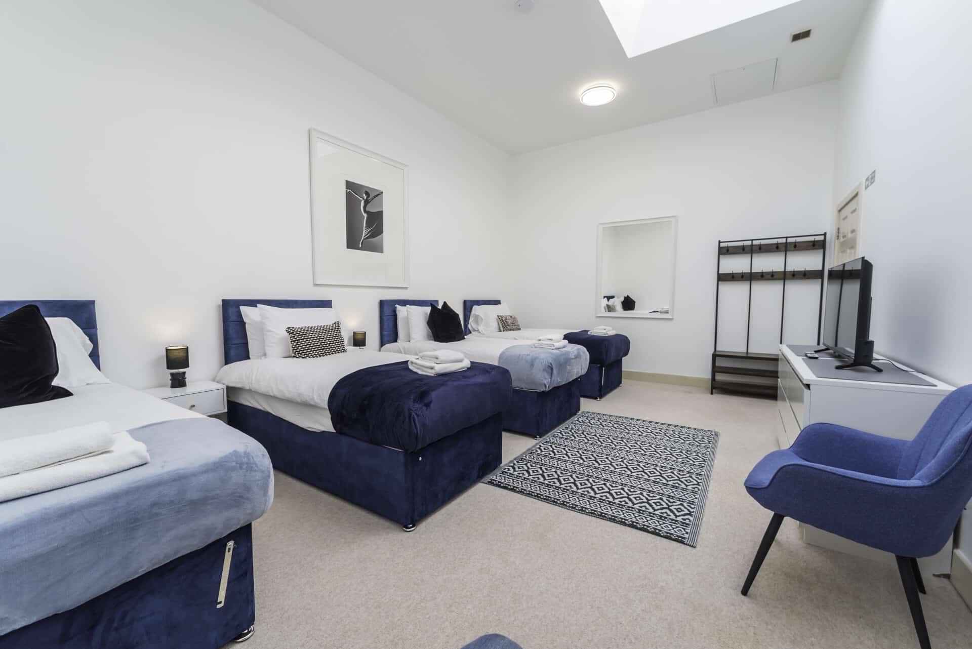 The property is arranged over three floors and features a bright open-plan kitchen, dining, and living area complete with a large TV and sofa beds, creating a relaxed and sociable space. There are four well-sized bedrooms with flexible sleeping arrangements, including zip-and-link beds, plus a dedicated office space on the ground floor for remote work. Guests also benefit from two bathrooms, making it suitable for larger groups.